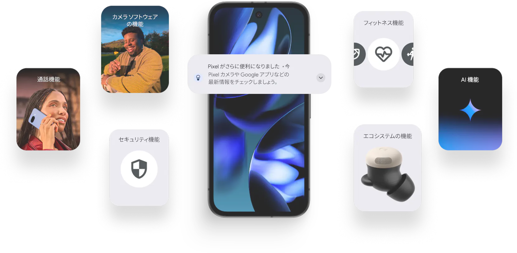 - ※1 Google Pixel アップデートが提供される期間は、米国の Google ストアでのデバイス販売開始日から 7 年間です。 詳しくは、 g.co/pixel/updates 新しいタブで開きますをご覧ください。