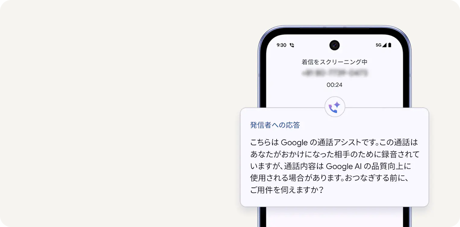 ※1 リサイクルされたアルミニウム、ガラス、プラスチックを使用しています。これらのリサイクル素材は、重量ベースで製品の 23% 以上に使用されています。※2 デバイスは工場出荷時点で IEC 規格 60529 の IP68 の防水および防塵性能を満たすように設計されていますが、完全な防水または防塵ではありません。アクセサリは防水、防塵ではありません。防水および防塵性能は永久的には持続せず、時間の経過に伴って、通常の使用による摩耗、デバイスの修理、分解、損傷によって徐々に低下または消失します。デバイスの耐落下性能は完全なものではありません。デバイスを落下させると、防水、防塵性能が失われる場合があります。落下その他の外的な衝撃による損傷は保証の対象外となります。液体による損傷の場合、保証が無効になります。詳しくは、 g.co/pixel/water 新しいタブで開きます をご覧ください。 ※3 「 30 時間以上」について: バッテリー駆動時間は、Google Pixel ユーザーのバッテリー使用プロファイル中央値を使用して、通話、データ通信、待受やその他の機能の使用などを組み合わせたテストに基づく推定値です。「最大 100 時間」について: バッテリー駆動時間は、Google Pixel ユーザーのバッテリー使用プロファイル中央値を使用して、通話、データ通信、待受や、( 5G 接続を含むさまざまな機能が無効になる)スーパー バッテリー セーバー モードでもデフォルトでオンになっているその他一部の機能を組み合わせたテストに基づく推定値です。「 30 時間以上」と「最大 100 時間」について: バッテリー テストは、 2024 年終盤に米国カリフォルニア州の大手携帯通信会社のネットワークで、生産開始前の初期設定状態のハードウェアおよびソフトウェアを使用して実施されました(ただし「最大 100 時間」のバッテリー駆動時間のテストに限り、スーパー バッテリー セーバー モードを有効にしています)。テストはスマートフォンが完全に充電された状態で開始しています。バッテリー駆動時間はさまざまな要因によって変動します。特定の機能を使用すると短くなります。実際のバッテリー駆動時間はこれより短くなる可能性があります。時間の経過とともに、バッテリーのパフォーマンスは Google Pixel のソフトウェアによって適切に管理され、長期間にわたってバッテリーを使用しても、その状態が健全に保たれます。詳しくは g.co/pixel/batteryhealth 新しいタブで開きます をご覧ください。 ※4 お使いの Google Pixel に Pixel Drop を適用できる期間については、 g.co/pixel/updates をご覧ください。Google Pixel の一部の Pixel Drop については、提供状況が異なる場合があります。